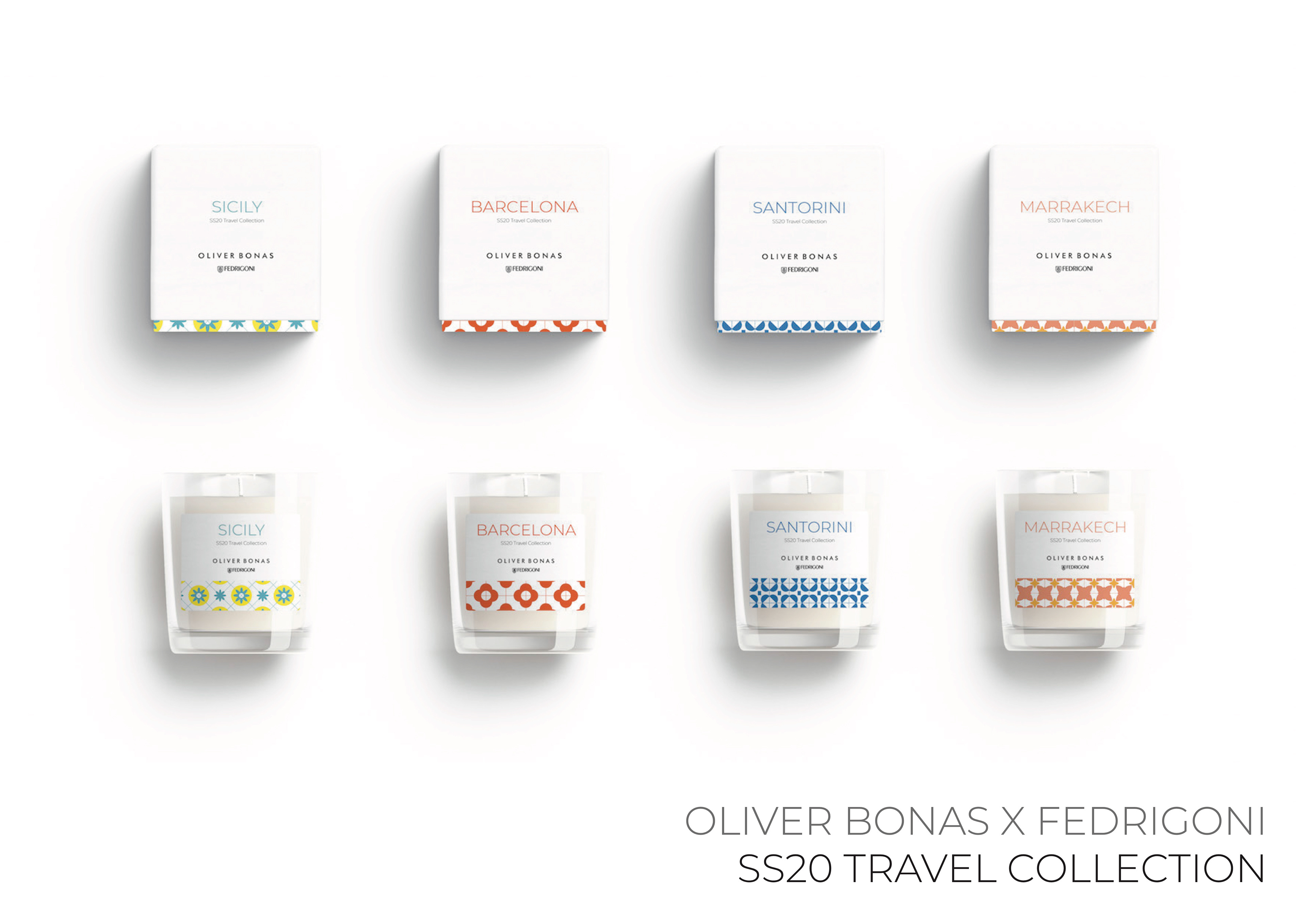The collection is based on the excitement of going on holiday and the nostalgia you feel afterwards. Bright coloured patterned tiles have joyful memories of being abroad with destinations across the globe having traditional ceramic tile designs. This is the theme of my SS20 Travel Collection for Oliver Bonas X Fedrigoni. Each tile pattern is symbolic to the destination through its design and colour palette. The candles work harmoniously together as a collection through the layout of design.