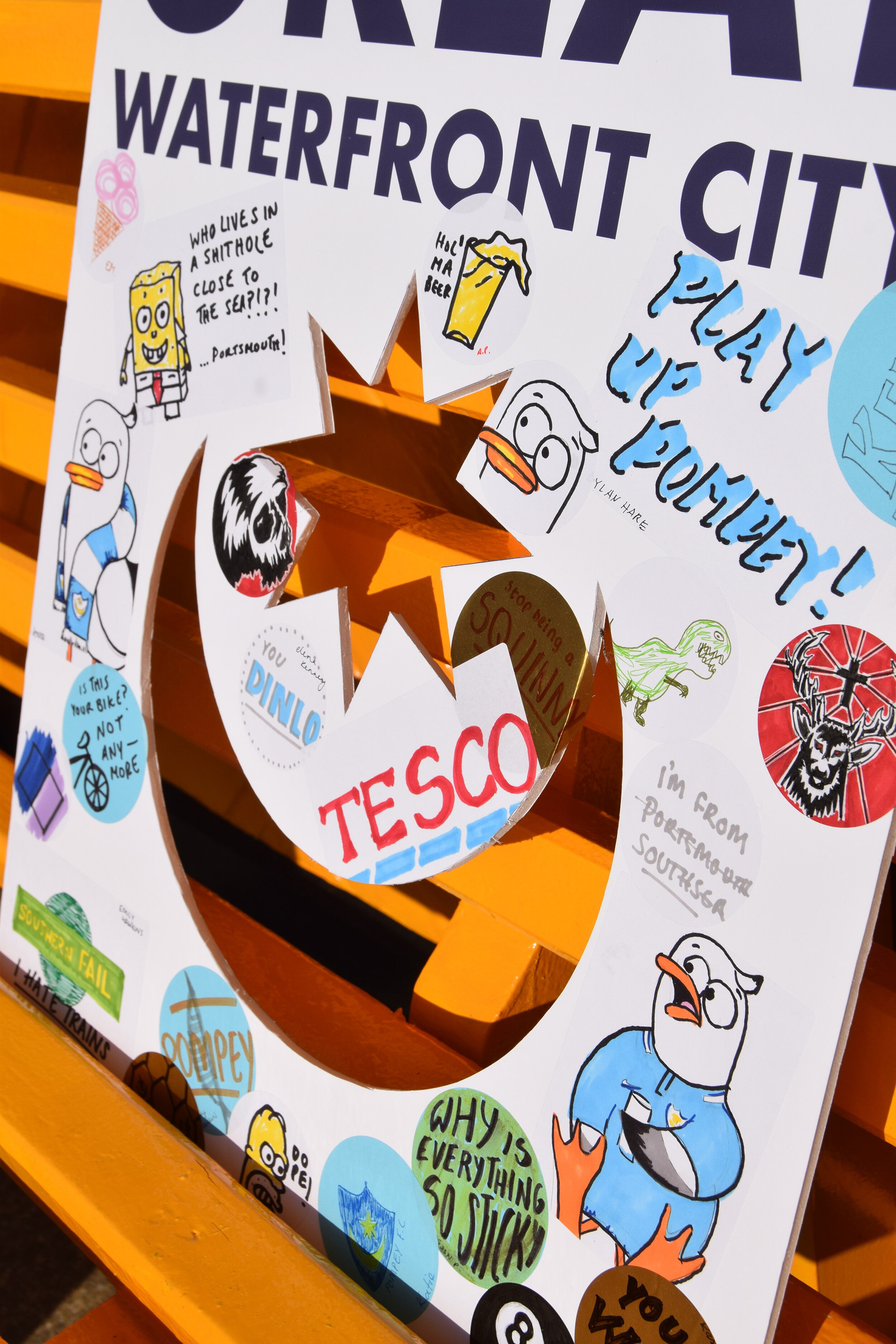 For a research project on Portsmouth, I analysed stickers around the creative city. From this research I generated this interactive poster design – I gave out blank stickers to people and asked them to draw whatever comes to mind when they think of Portsmouth. These stickers were then stuck to a foam board cut-out poster which I photographed around the city. The poster can continue to be layered with other sticker designs.